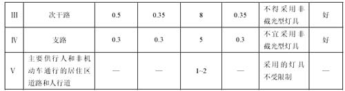 注:1、表中所列的平均照度僅適用于瀝青路面,若系水泥混凝土路面,其平均照度值可相應(yīng)降低 20~30%。
