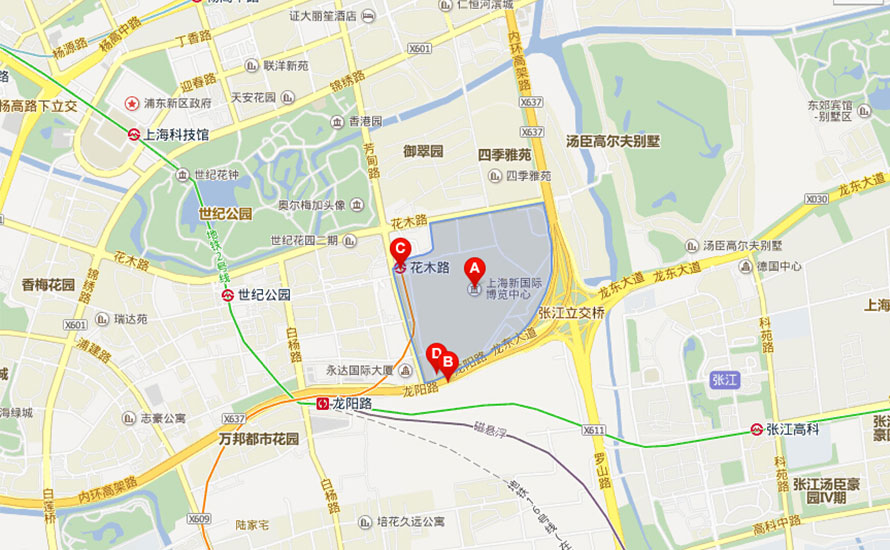 SNIEC位于龍陽路、羅山路交匯處,易于通行。從市中心橫跨南浦大橋、楊浦大橋可直達。