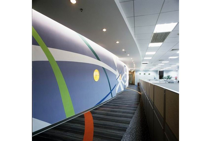 HP惠普上?偛哭k公室裝修設(shè)計(jì),設(shè)計(jì)元素融入了惠普的打印強(qiáng)項(xiàng),接待處的波浪形吊頂與蜿蜒的墻壁造型仿佛一張連貫的紙,上面的圖案也像彩印一樣的多彩清晰?臻g利用大膽的圖像、色彩和材料,通過不同尋常的空間布局,創(chuàng)造出古怪特別的感覺。
