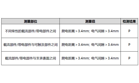 爬電距離與電氣間隙同樣是產(chǎn)品安全運行的重要憑據(jù),當(dāng)這個間隙小到一定程度時,在電場的作用下,空氣介質(zhì)就會被擊穿,絕緣失效或暫時失效,引發(fā)安全問題。本次樣品爬電距離與電氣間隙滿足標(biāo)準(zhǔn)要求的最小安全距離,產(chǎn)品可以安全運行。