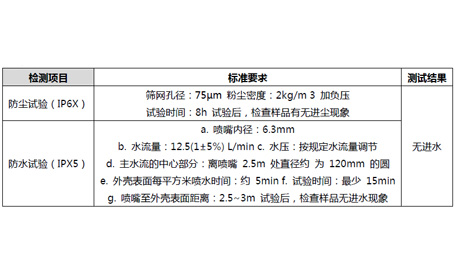IP等級是衡量戶外燈具的一個重要指標(biāo),進水可能引發(fā)安全問題,進塵則會影響燈具正常發(fā)光。此次樣品IP等級為65,實驗嚴(yán)格按照標(biāo)準(zhǔn)對IP65相關(guān)要求進行測試,測試過程中無進塵與進水現(xiàn)象發(fā)生......[詳細(xì)]