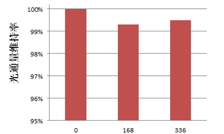 老化條件為 85℃&85%RH,老化過程中樣品以 540mA 電流點(diǎn)亮,分別 在 0h、168h 和 336h 進(jìn)行光色電性能測(cè)試,其光通量維持率如圖 7 所示。