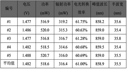 隨機(jī)選取的5顆樣品在350mA電流狀態(tài)下,輸出的平均輻射功率為 316.4mW,電光轉(zhuǎn)換效率為 61.00%,平均峰值波長為 858.9 nm,半波寬為35.5nm。