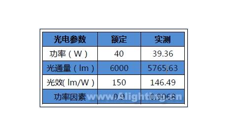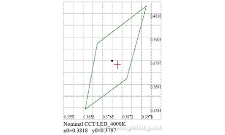 傳統(tǒng)的LED照明由于芯片的因素決定了高光效的芯片,色溫上會(huì)偏高,往往為了達(dá)到整燈的高光效、照度達(dá)到要求而會(huì)舍棄色溫上的適應(yīng)性。不過,隨著越來越多的用戶注重現(xiàn)場(chǎng)照明效果從人的需求出發(fā),需求在不同性質(zhì)、不同等級(jí)的道路或環(huán)境相對(duì)應(yīng)的有供選擇最佳色溫區(qū)間。比較合適的色溫是4000~5000K左右,這時(shí)視覺比較舒適,同時(shí)光效較高。這款樣品的額定色溫為4000K,實(shí)測(cè)色溫為3899K,在保證樣品高光效同時(shí),也選擇了一個(gè)讓人更為舒適的色溫區(qū)間。