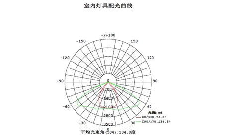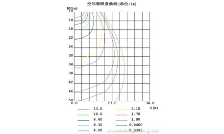 從配光曲線圖可看出,這款樣品采用了蝙蝠翼型配光,C0/180面為73.5度,C90/270面為134.5度,平均光束角為104度,結(jié)合空間等照度曲線,考察的是該燈具下10m到50m,距離34m的截面(C0平面)的照度分布情況。