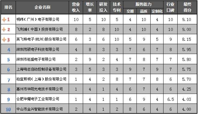 1. 營(yíng)業(yè)額、增長(zhǎng)率、研發(fā)投入、技術(shù)專利是以實(shí)際數(shù)據(jù)為基礎(chǔ)的區(qū)間打分,服務(wù)能力和行業(yè)口碑是根據(jù)100家下游大功率LED電源應(yīng)用企業(yè)的問(wèn)卷調(diào)查數(shù)據(jù)綜合打分所得;
