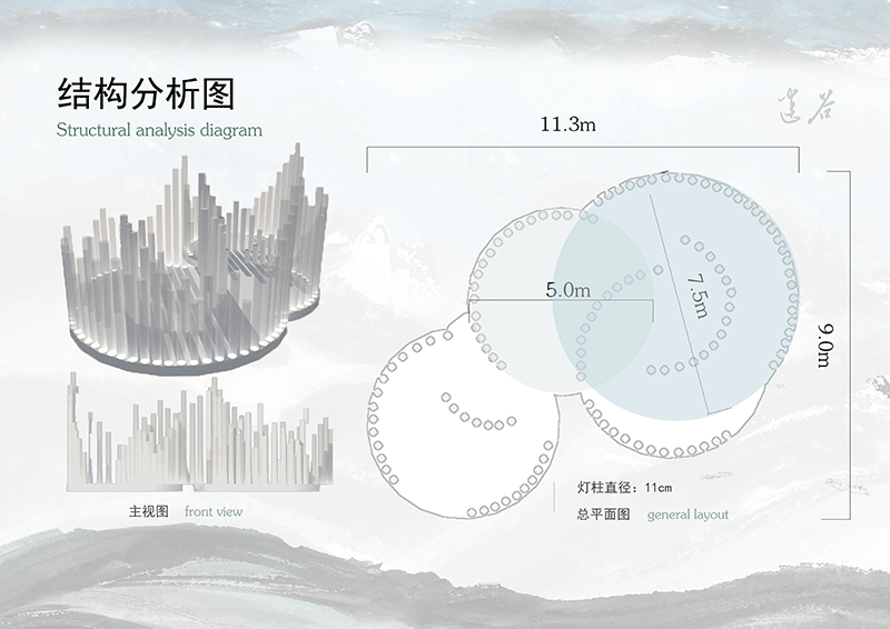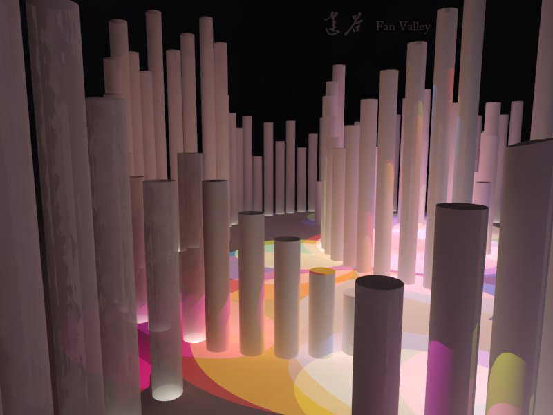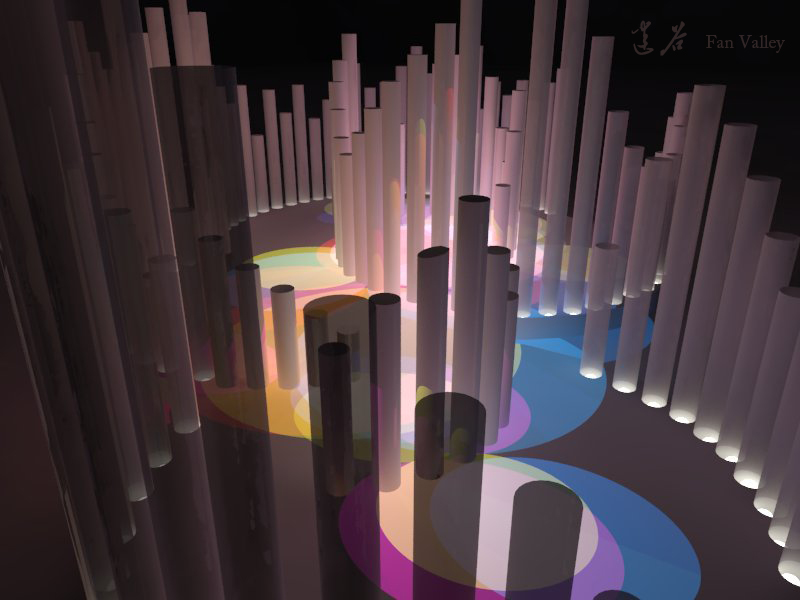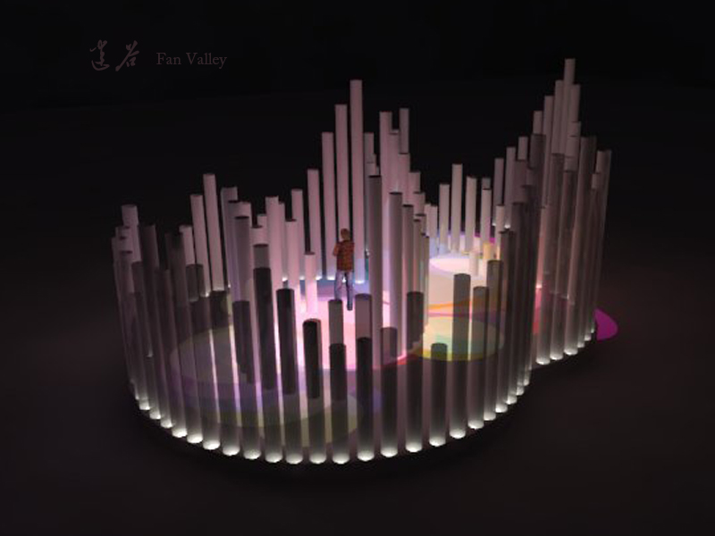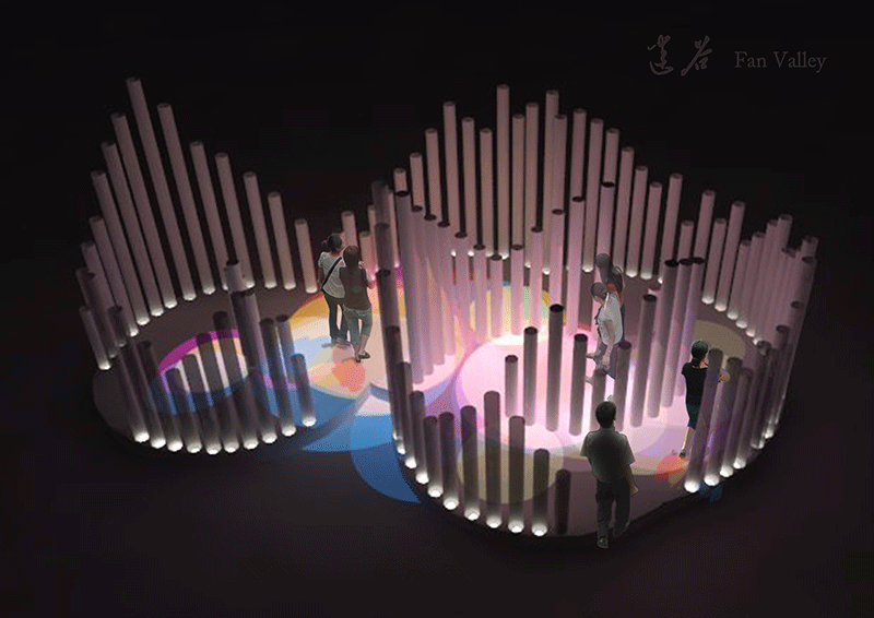 以此作為我們作品的設(shè)計(jì)理念,我們采取小圓柱組成不規(guī)則的弧形,形狀像構(gòu)樹版曲折,但是光華四方,形成以光為媒介,與人互動虛實(shí)結(jié)合,聲感互動的燈光設(shè)計(jì)。四周采取亮度較暗的燈,內(nèi)部則安裝LED燈,采用紅、黃、藍(lán)三種基本顏色的LED燈珠芯片,聲感互動體系,采用LED照明柔和,護(hù)眼。節(jié)能環(huán)保,使用壽命長。