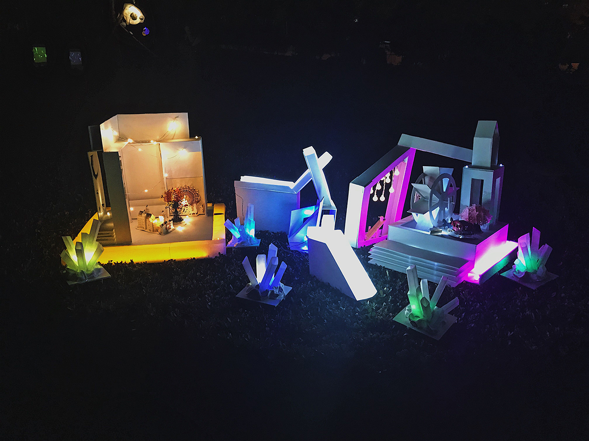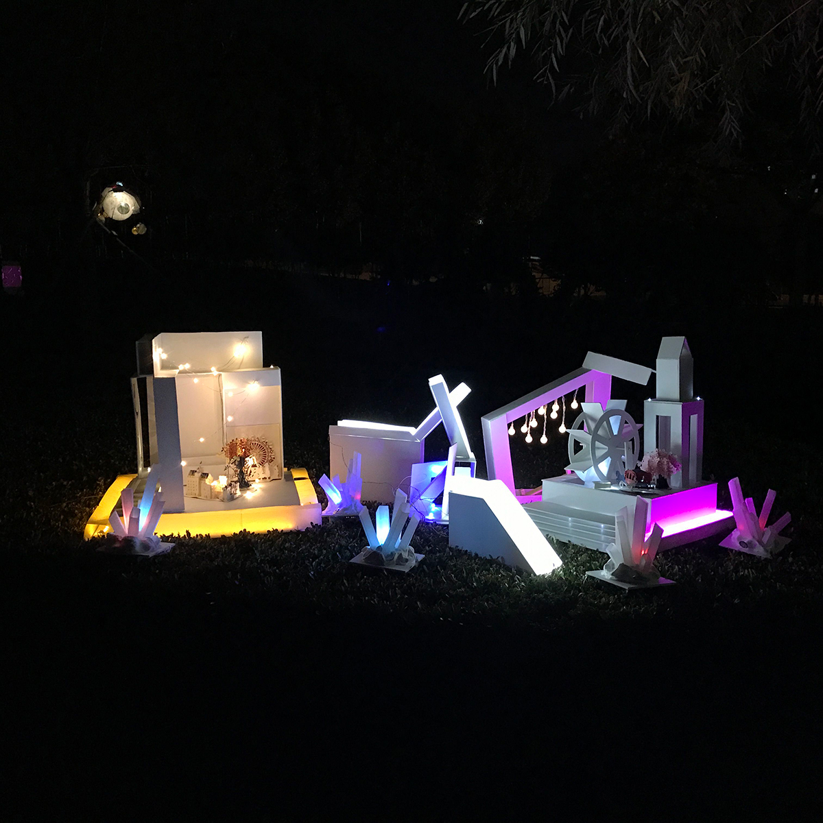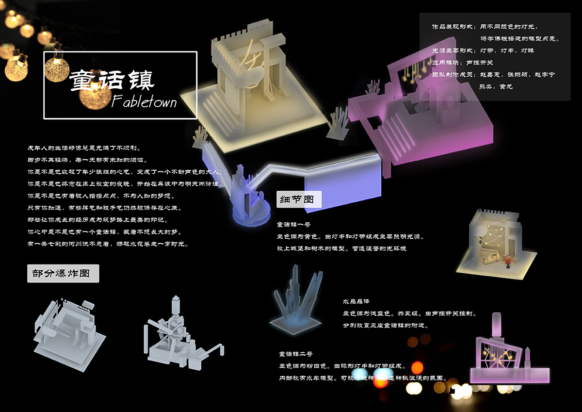 一座童話鎮(zhèn),由三座城堡相互連接,通過電路和機關(guān)設(shè)置點亮整組城堡。利用類似旋轉(zhuǎn),拼接的機關(guān),通過一條道路鏈接三座城,道路需全部連接在一起才能點亮。 城堡用白色的雪佛板搭建而成,分別用黃,藍(lán),粉色led燈帶打亮,連接道用白色燈帶,再用暖白色燈珠加以裝飾。三座城堡分別象征權(quán)利富貴,溫馨浪漫,自由隨性,寓意每個人都有不同的追求,無論選擇了哪條路,堅持走下去,都會擁有一個多彩的人生。