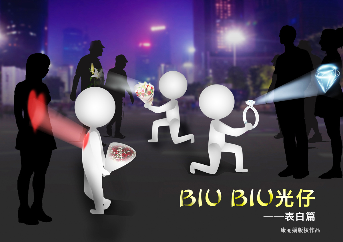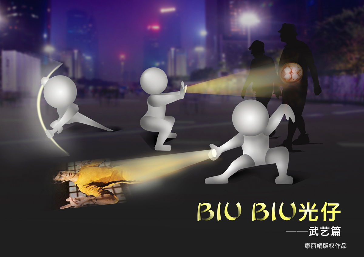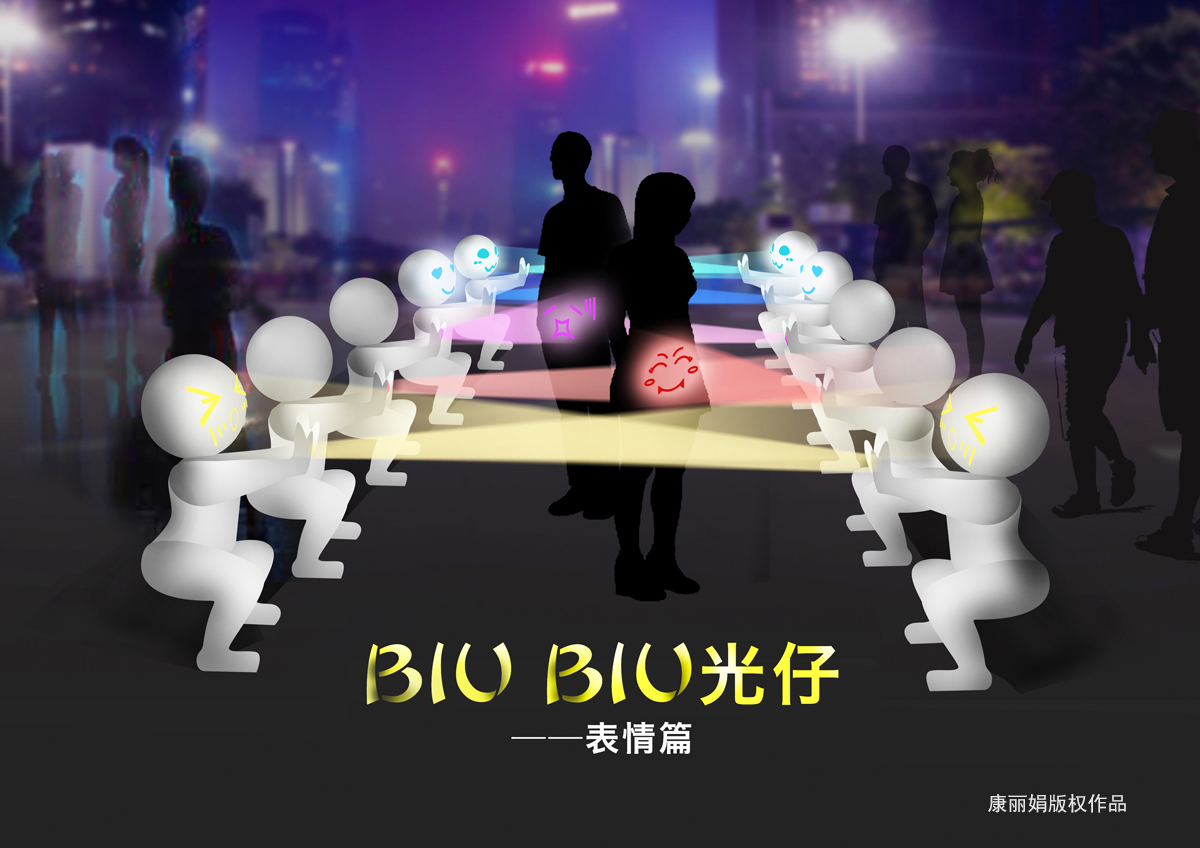 以簡(jiǎn)潔的原創(chuàng)Biu Biu光仔為設(shè)計(jì)載體,通過(guò)形象的武術(shù)動(dòng)作,配合動(dòng)態(tài)的光影效果展示廣東傳統(tǒng)的武術(shù)精神和廣州的特色美食。設(shè)計(jì)由三個(gè)Biu Biu光仔組成,一個(gè)為武打動(dòng)態(tài)為主,手中以光為武器展示武藝和光藝的結(jié)合。另一個(gè)為下蹲姿勢(shì),當(dāng)人們走近Biu Biu光仔時(shí),手掌則投射在游客身上廣州特色美食的動(dòng)態(tài)光影。最后一個(gè)則投影在地面動(dòng)態(tài)的展示廣東的武術(shù)大師風(fēng)采(如李小龍、葉問(wèn)、黃飛鴻等)。