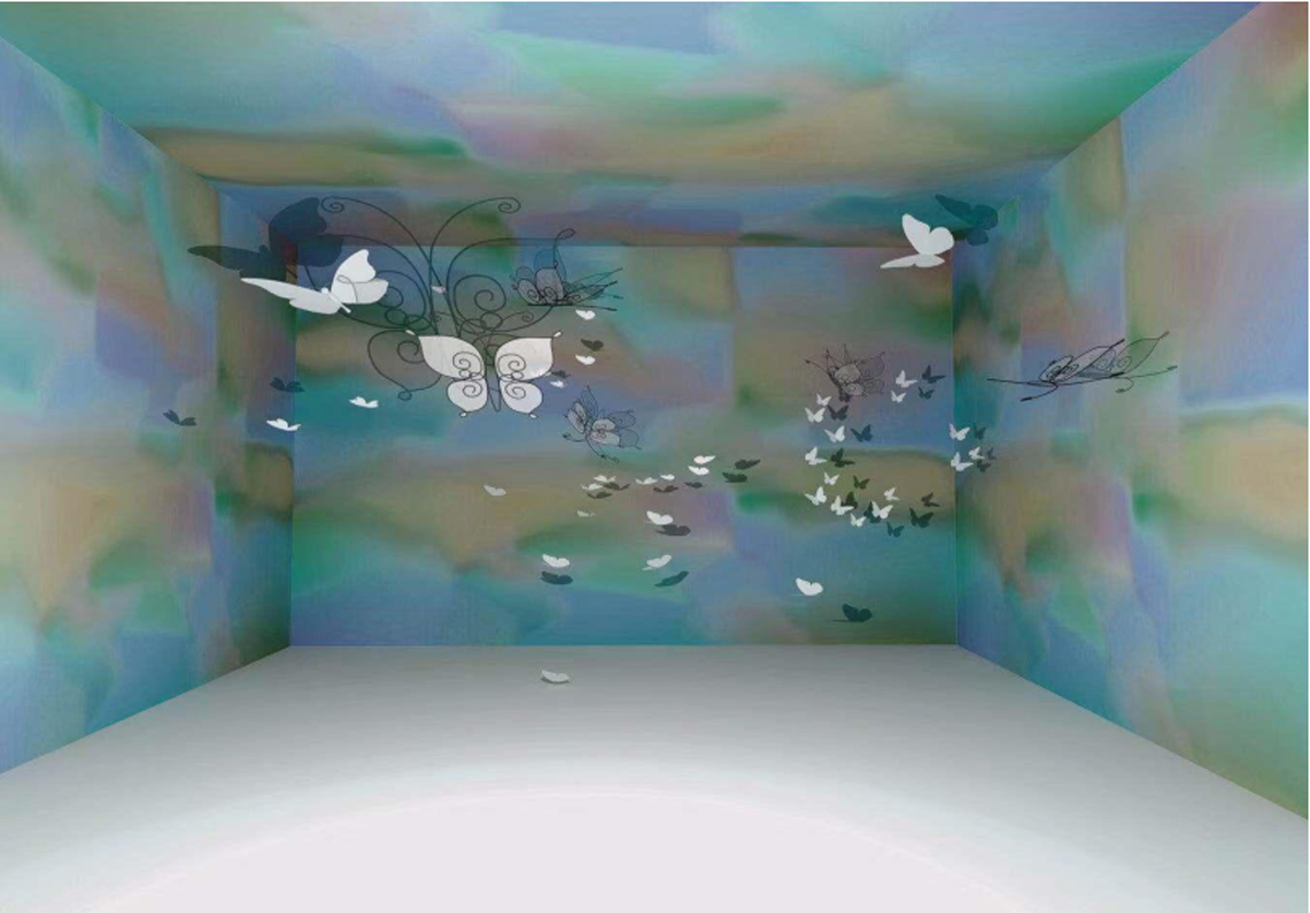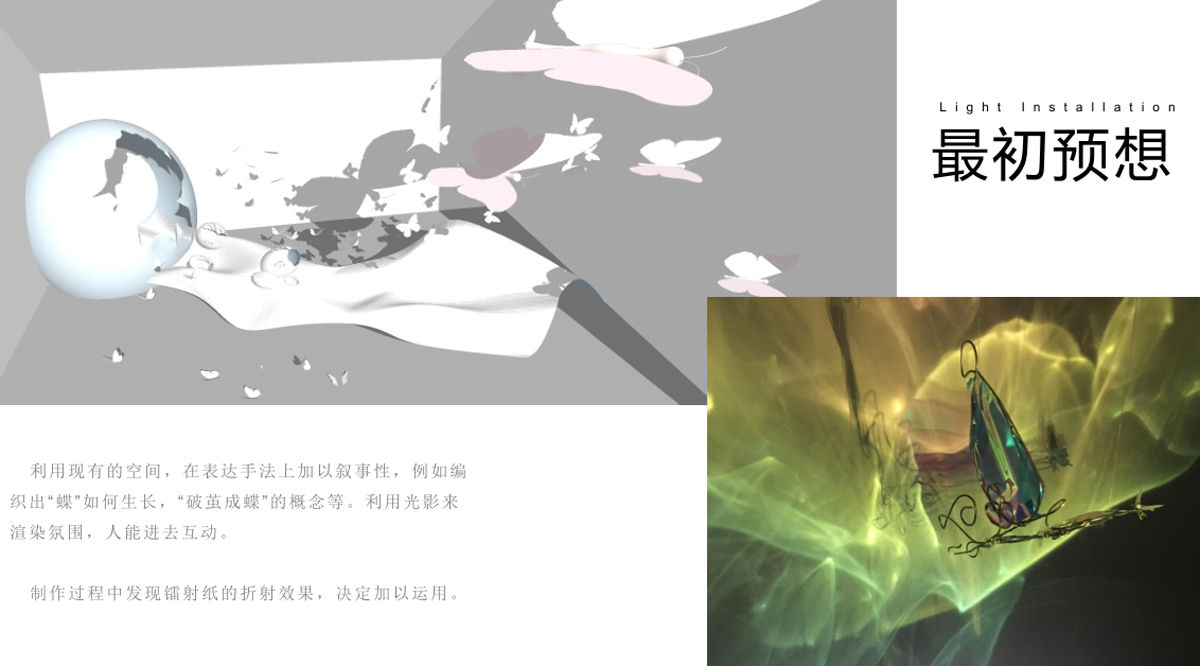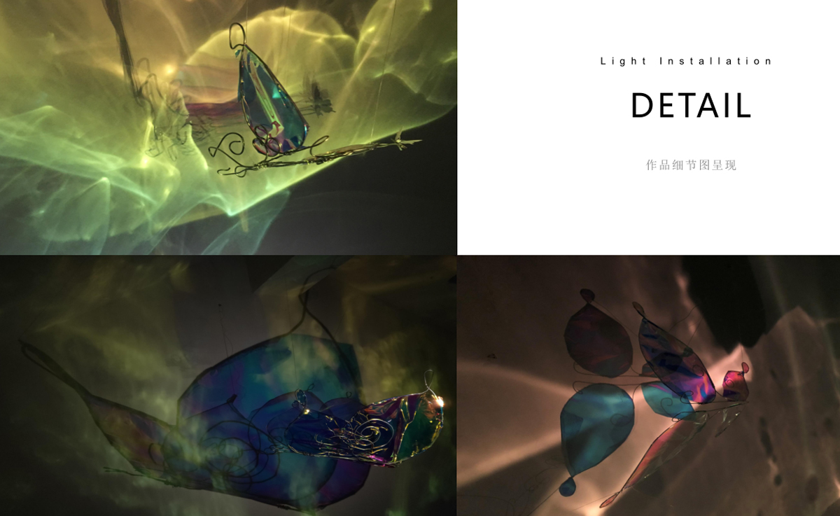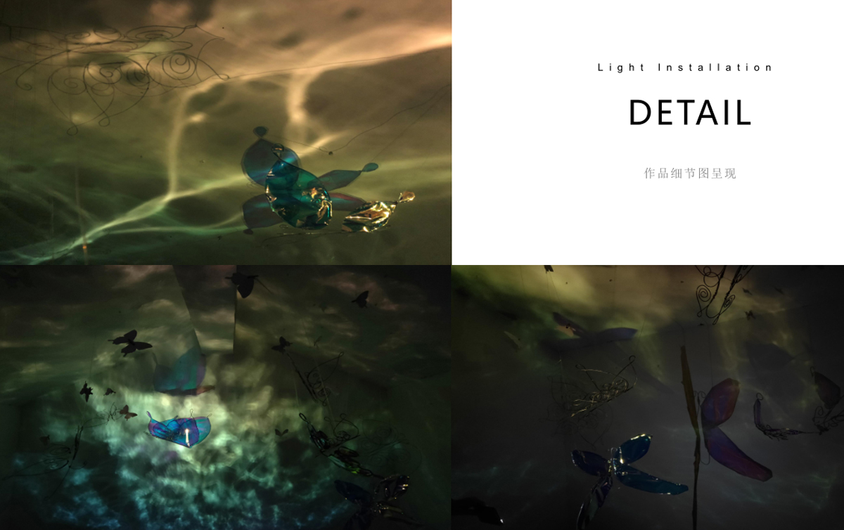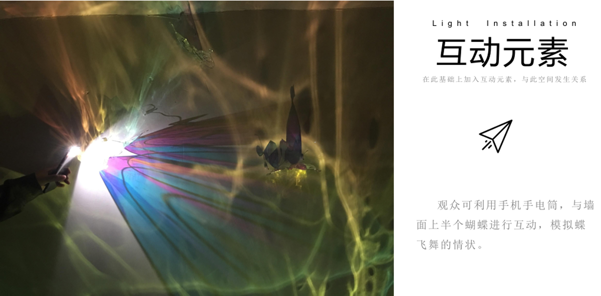 本作品源于“莊周夢蝶”典故,以“蝶”為創(chuàng)作媒介,利用鐵絲編織而成的“蝶”、燈光與鐳射紙結(jié)合的渲染以及音樂的感染,在空間中營造出一種夢幻神秘的氛圍。利用“蝶”的“實”與光影的“虛”結(jié)合以及利用鐵絲的重來表達輕盈等手法,從而引發(fā)人思考真實與虛幻的問題。作品意在將光影設為主角,實體的“蝶”僅為輔助,動態(tài)的光影秀與靜止的“蝶”相得映彰,讓人沉浸在這個空間中。