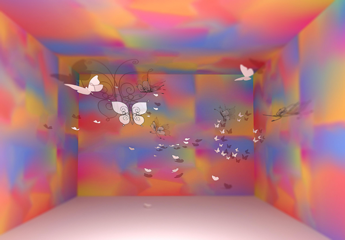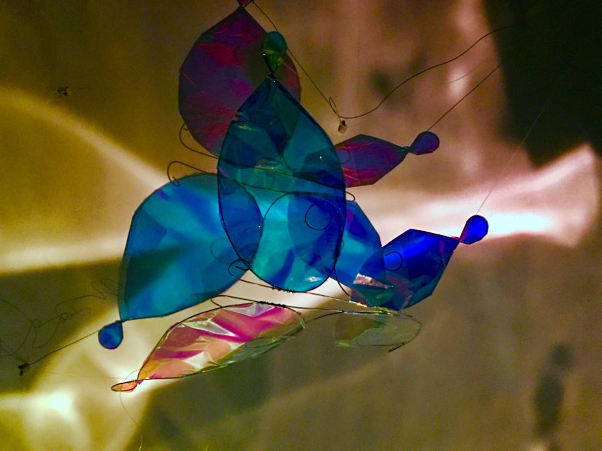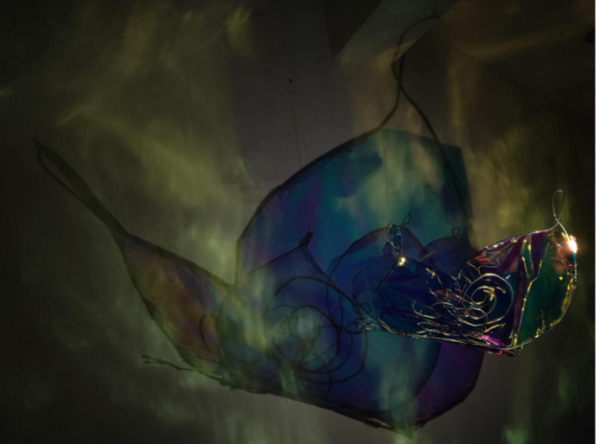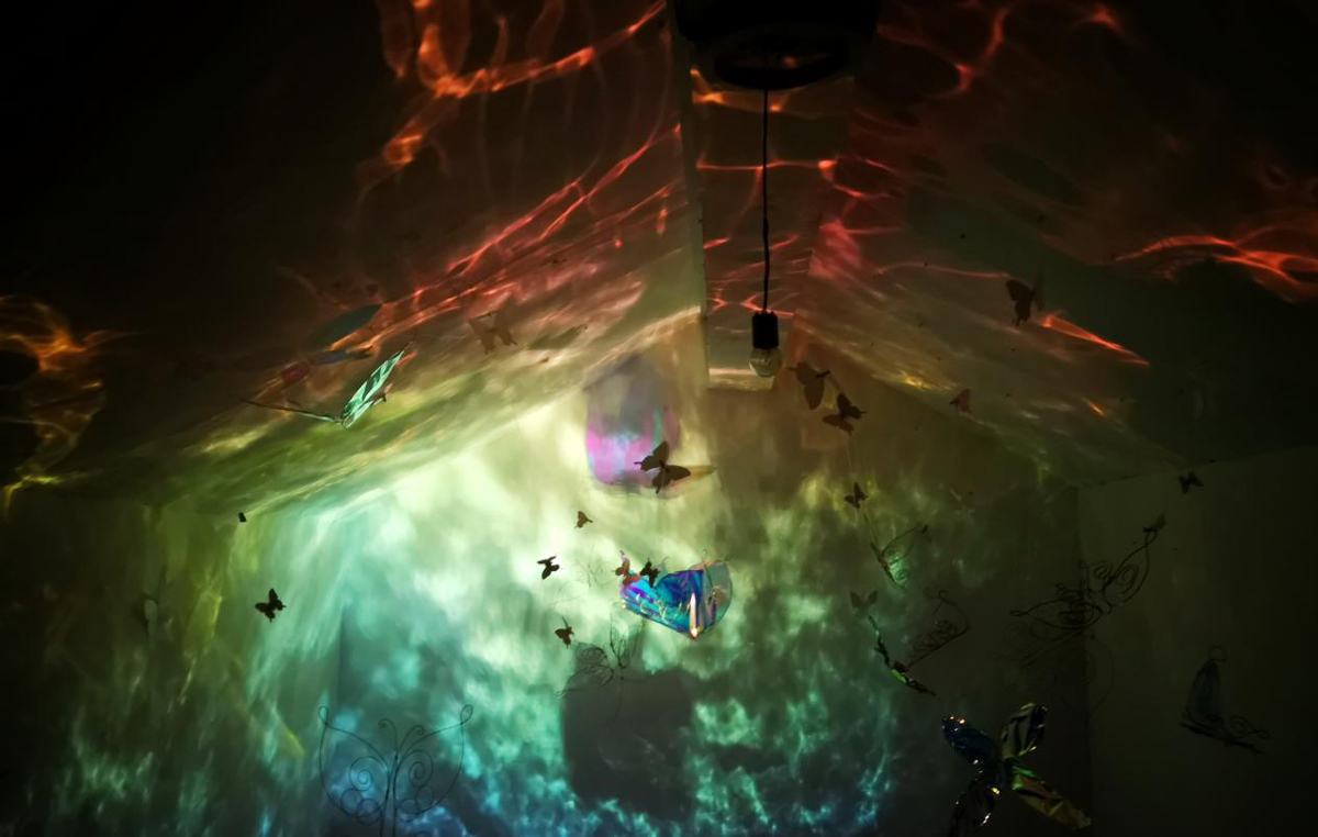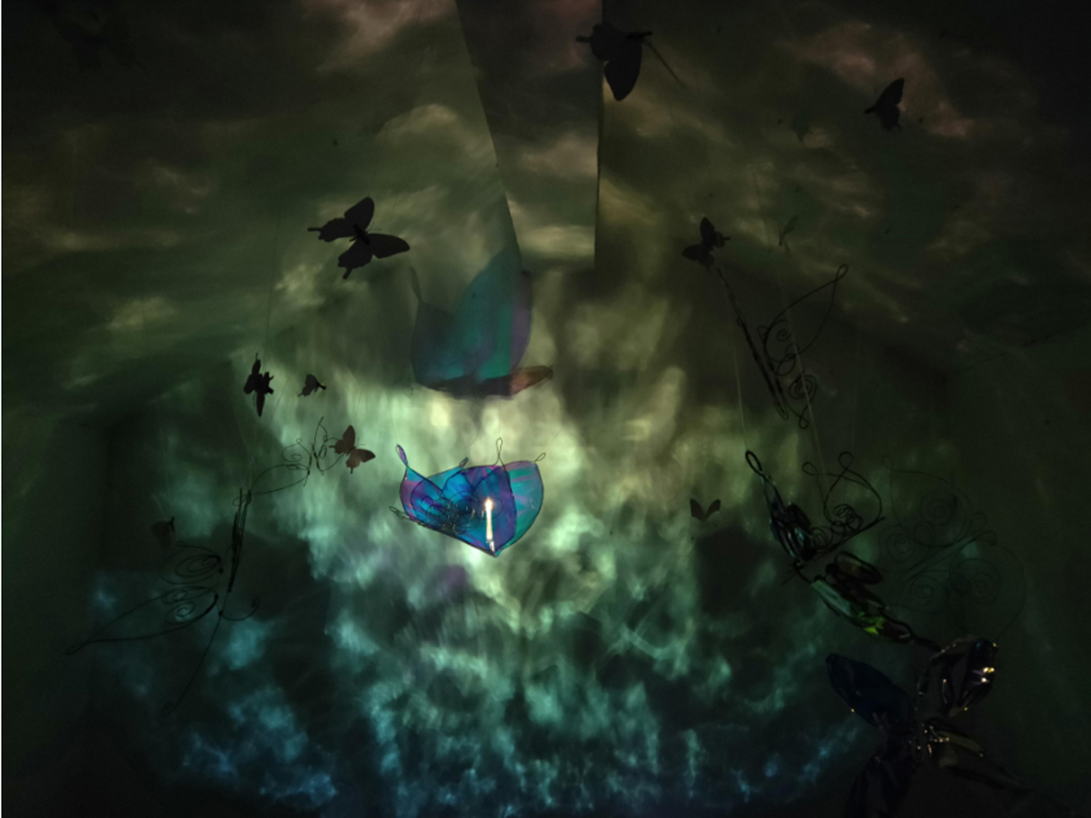 本作品源于“莊周夢蝶”典故,以“蝶”為創(chuàng)作媒介,利用鐵絲編織而成的“蝶”、燈光與鐳射紙結(jié)合的渲染以及音樂的感染,在空間中營造出一種夢幻神秘的氛圍。利用“蝶”的“實”與光影的“虛”結(jié)合以及利用鐵絲的重來表達輕盈等手法,從而引發(fā)人思考真實與虛幻的問題。作品意在將光影設為主角,實體的“蝶”僅為輔助,動態(tài)的光影秀與靜止的“蝶”相得映彰,讓人沉浸在這個空間中。