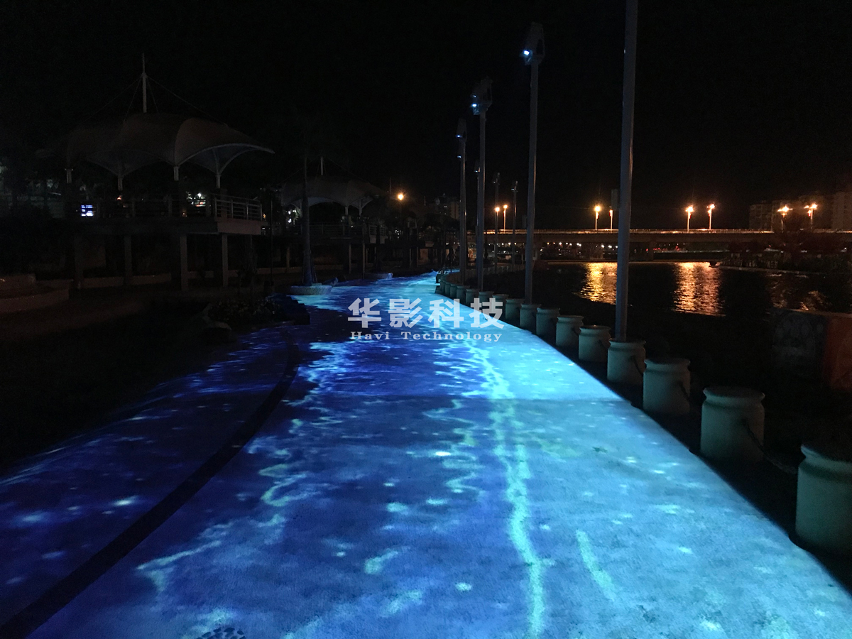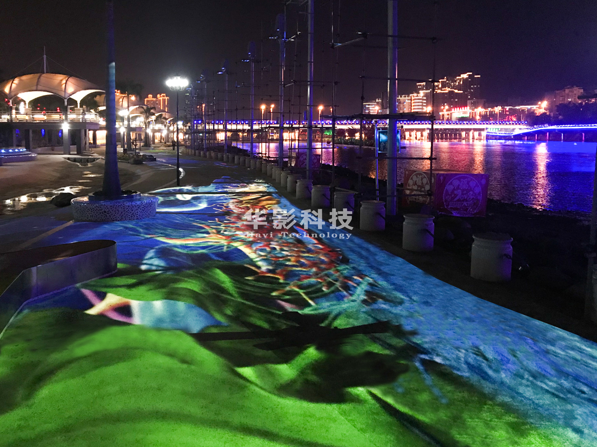 音樂(lè)和音效的配合下,地面上陸續(xù)播放不同的影片,呈現(xiàn)出波濤洶涌的海浪、繽紛花朵以及豐富的海底世界等特效。3D投影畫(huà)面設(shè)計(jì)逼真生動(dòng),給人以神奇的視覺(jué)、聲覺(jué)、感覺(jué)體驗(yàn)。