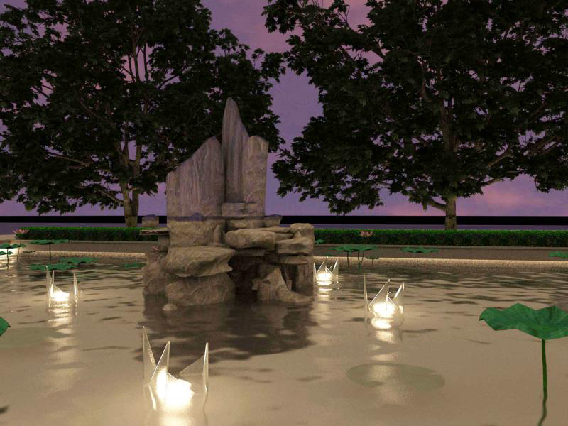 本次設(shè)計(jì)靈感源出于假山碎石掉入池中水平面濺起的一瞬間畫面。 將飛馳的水珠幾何化簡(jiǎn)為角形,意欲營(yíng)造冬季結(jié)冰時(shí)的形狀。荷花則迎夏,與之呼應(yīng),將本不該同時(shí)出現(xiàn)的兩種情景通過(guò)一靜一動(dòng)相結(jié)合。