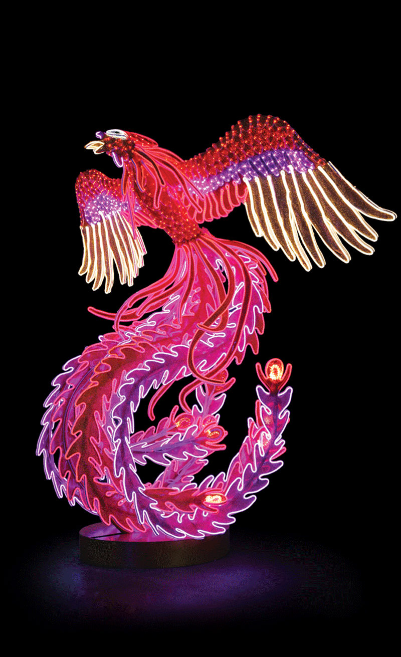 鳳凰是人們最喜愛(ài)的吉祥物之一,具有“華貴、偉岸、進(jìn)取、太平”的象征意義。該產(chǎn)品采用高亮度LED燈體及特殊透光布料來(lái)表達(dá),很好地突顯了展翅高飛的鳳凰華麗、高貴的特點(diǎn)。產(chǎn)品防水性好,亮度高、耗電量低,節(jié)能環(huán)保。廣泛應(yīng)用于各種燈光節(jié)、公園、商業(yè)廣場(chǎng)、酒店大堂等場(chǎng)所作為景觀造型裝飾燈飾。