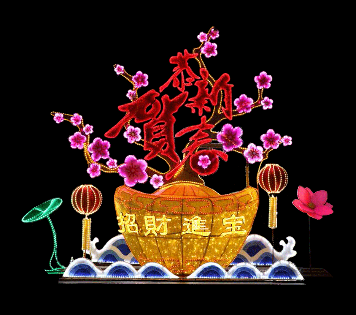 該產(chǎn)品由梅花、元寶、蓮花、燈籠等中國傳統(tǒng)元素組成,帶有濃厚的新春氣息,采用高亮度LED燈體及特殊透光布料制作而成,防水性好,亮度高、耗電量低,節(jié)能環(huán)保,是新春佳節(jié)理想的節(jié)日造型燈飾。廣泛應(yīng)用于各種燈光節(jié)、公園、商業(yè)廣場(chǎng)、酒店大堂等場(chǎng)所。