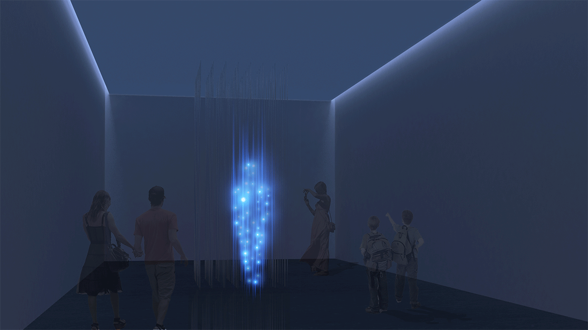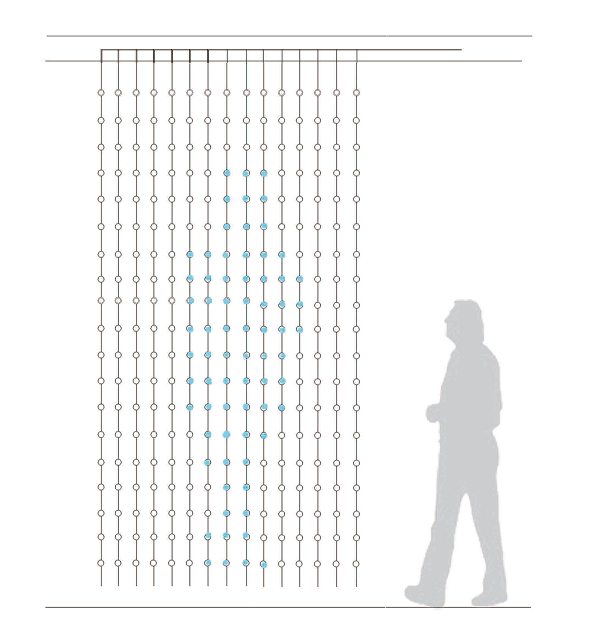 每個(gè)人都有這么一些人或者事惦記著,并把他們的得失看得很重。而當(dāng)你伸手去觸碰時(shí),會(huì)發(fā)現(xiàn)無(wú)法觸及。作品由若干個(gè)珠簾組成的立方體,立方體中是有燈光組成的立體人,參與者可以通過(guò)撥動(dòng)燈簾來(lái)參與作品,即伸手觸碰則立方體中的人形便會(huì)打散。