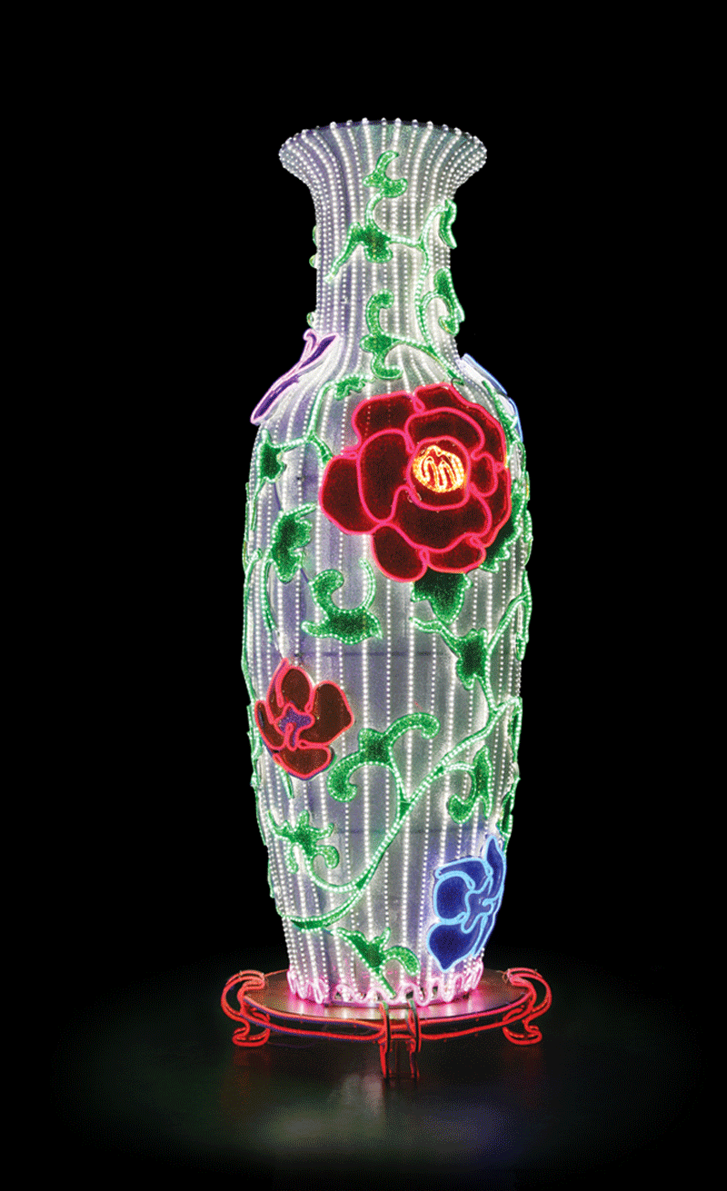 該產(chǎn)品取材于中國傳統(tǒng)瓷器大花瓶,寓意為吉祥平安,具備濃厚的中國傳統(tǒng)文化氣息。產(chǎn)品采用高亮度LED燈體及特殊透光布料制作而成,防水性好,亮度高、耗電量低,節(jié)能環(huán)保。廣泛應(yīng)用于各種燈光節(jié)、公園、商業(yè)廣場、酒店大堂等場所作為景觀造型裝飾燈飾。