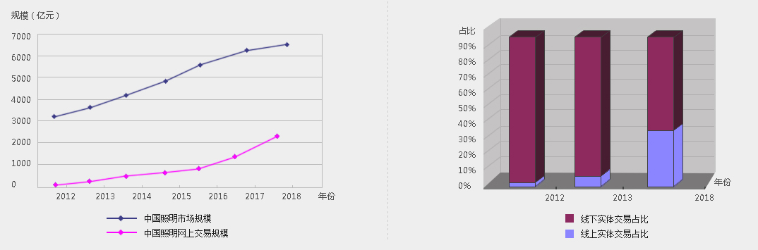 2013年,中國網(wǎng)絡(luò)購物市場規(guī)模約1.85萬億元,在社會零售總額中占比7.8%。保守估計在2017年超4萬億元。(該數(shù)據(jù)僅統(tǒng)計B2C和C2C的交易量)2013年中國照明市場規(guī)模約為3600億元,電商交易占比4.1%,約147.6億元;預(yù)計2018年中國照明市場規(guī)模6500億元,到2018年,網(wǎng)上交易規(guī)模增長754%,網(wǎng)上交易占比將達35%,交易金額可達2275億元。